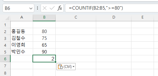 | 80점 이상 학생 수 | =COUNTIF(B2:B10,">=80") | 80 이상인 셀 개수 |