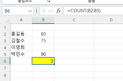 | COUNT | 숫자가 입력된 셀 개수 | 숫자만 계산 |