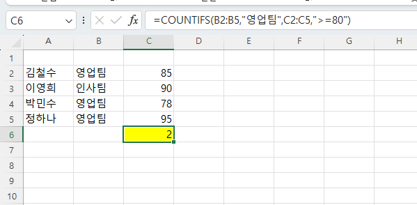 | “영업팀” 소속 직원 수 | =COUNTIF(C2:C20,"영업팀") | 텍스트 조건 가능 |