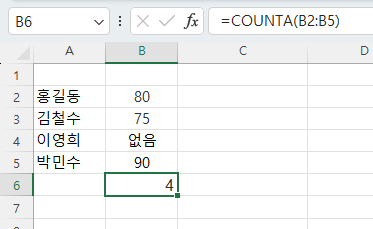 | COUNTA | 비어 있지 않은 셀 개수 | 문자 포함 |