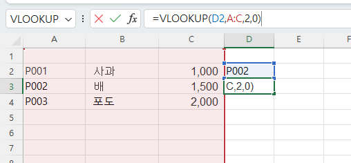 | P002 | =VLOOKUP(D2,A:C,2,0) | 배 |