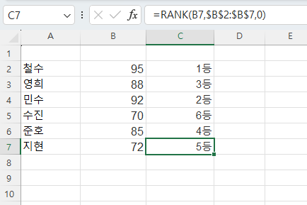 | 철수 | 95 | =RANK(B2,$B$2:$B$7,0) → 1등 |