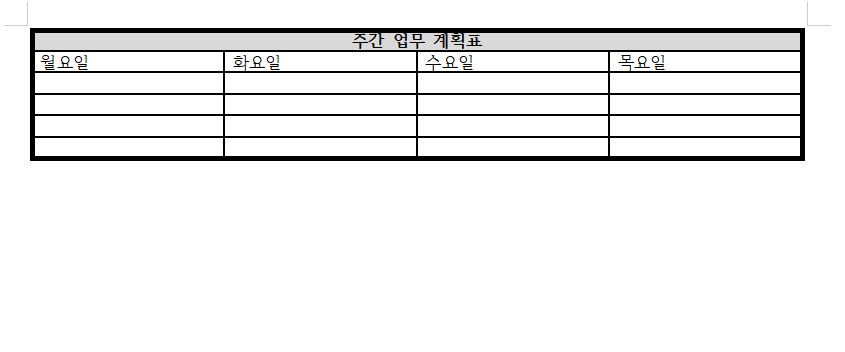 (3) 2행에 입력: 월요일 | 화요일 | 수요일 | 목요일 (4) 표 안에서 오른쪽 클릭 → 줄 추가 2회 → 총 6행 만들기